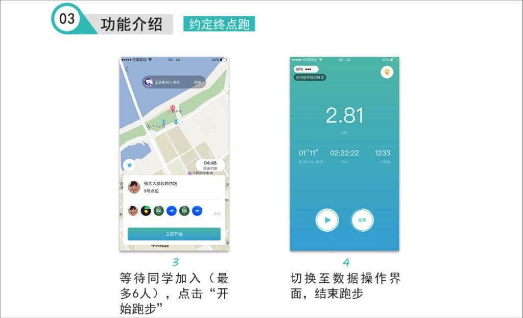 “运动世界校园”:随机终点一般用于单人跑步,常用。约定终点可在预选点位中设定一个终点,约其他人一起跑,最多可约6人,加入约跑后,5分钟内没有进行跑步,将自动退出约跑。