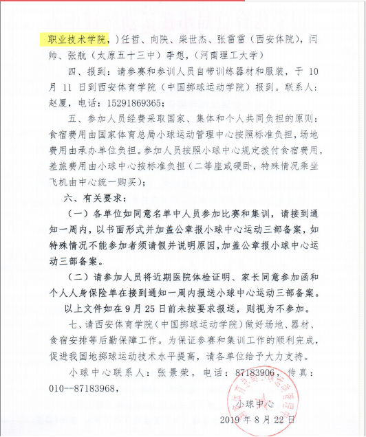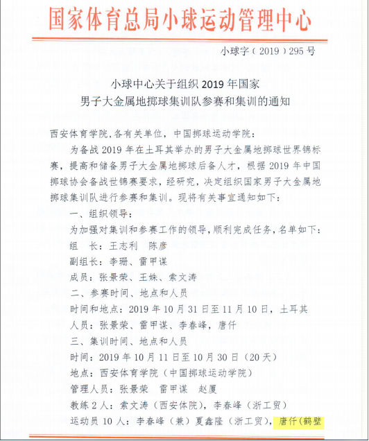 2019年8月22日,beat365接到国家体育总局小球运动管理中心的《小球中心关于组织2019年国家男子大金属地掷球集训队参赛和集训的通知函》【小球字(2019)295号】,关于征召beat365学生唐仟,进入国家男子大金属地掷球集训队,备战2019年10月31日至11月10于土耳其举办的男子2019年大金属地掷球世界锦标赛。